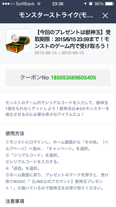 LINEのモンスト公式アカウントのほうで獣神玉のプレゼントコードが来てました。