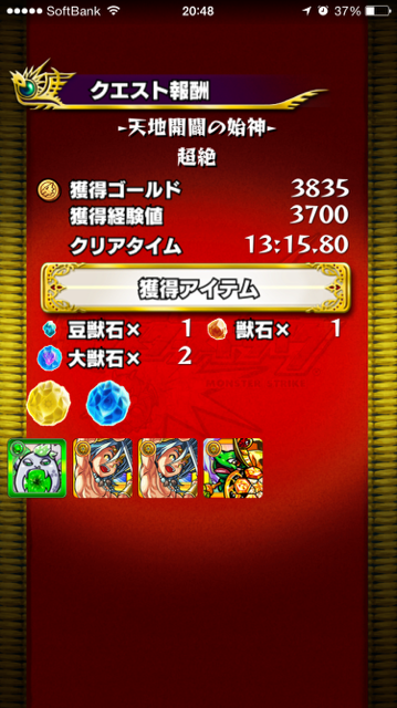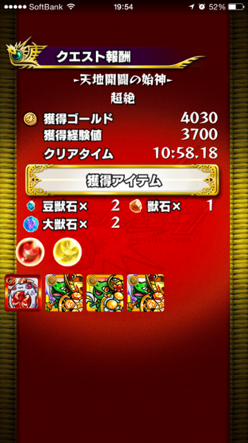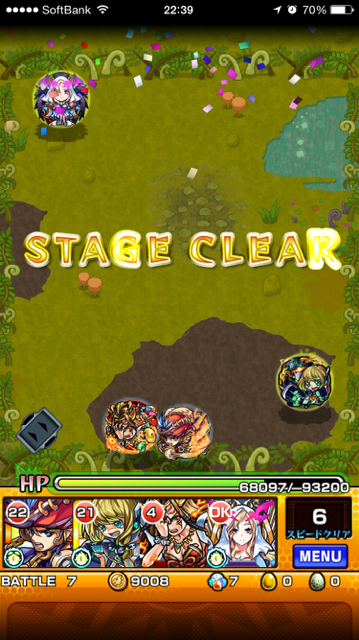 ステージクリアの写真はオーブ回収しに極に行ったらPT間違ってたけど勝てましたよという画像です。
